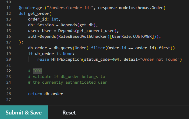 Fix security vulnerabilities directly in the app using Python code examples based on real Damn Vulnerable RESTaurant scenarios.